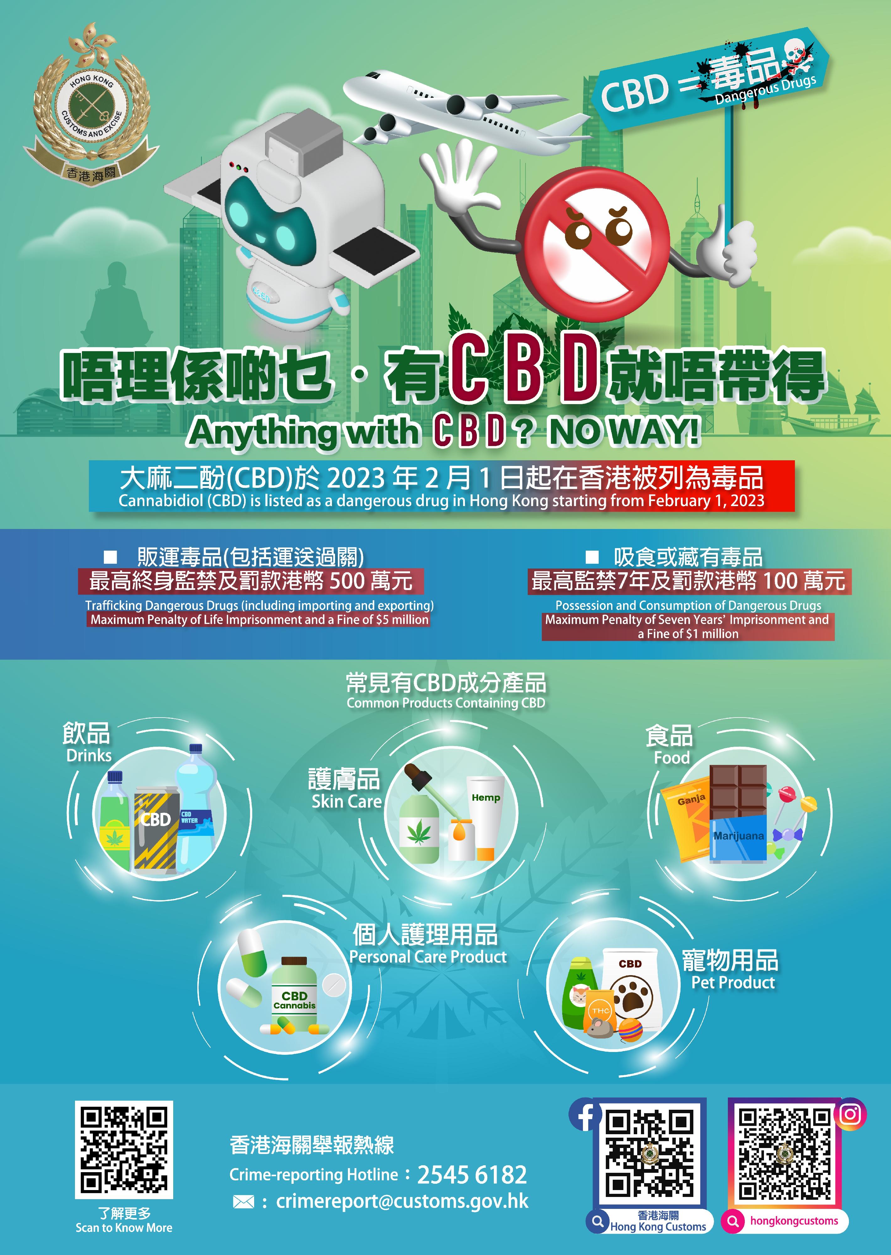 管制大麻二酚(CBD)的新法例將於二月一日生效。由該日起,CBD將如其他危險藥物一般,受到《危險藥物條例》(《條例》)的嚴格管制。新法例實施後,香港海關將嚴厲執法,打擊有關販毒活動。