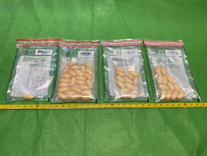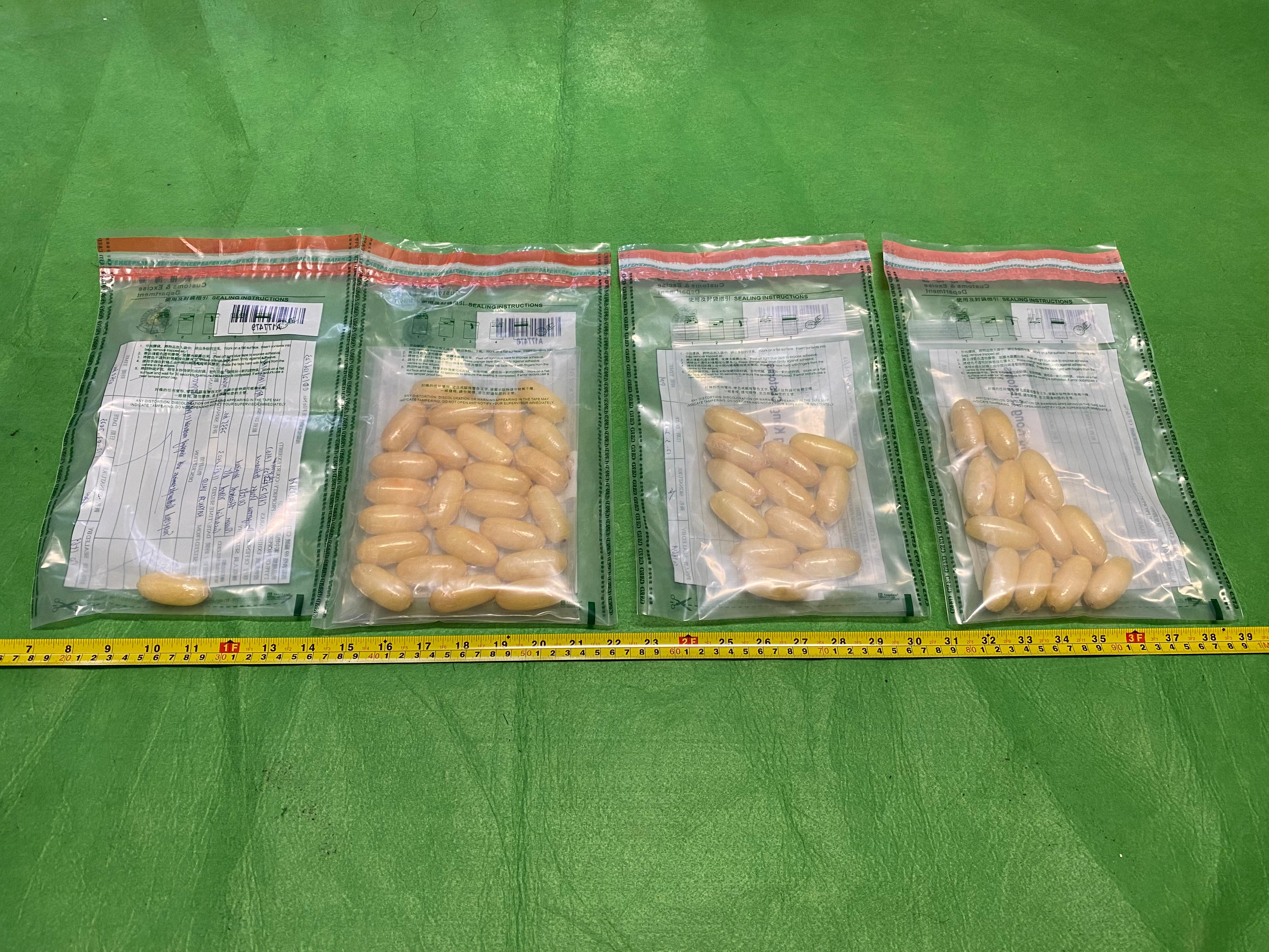 經檢查後,海關人員昨日確認該名男子體內藏有異物,隨即把他拘捕。截至今日(三月十二日)下午六時,被捕男子已從體內排出四十九粒共重約六百四十克的懷疑冰毒。