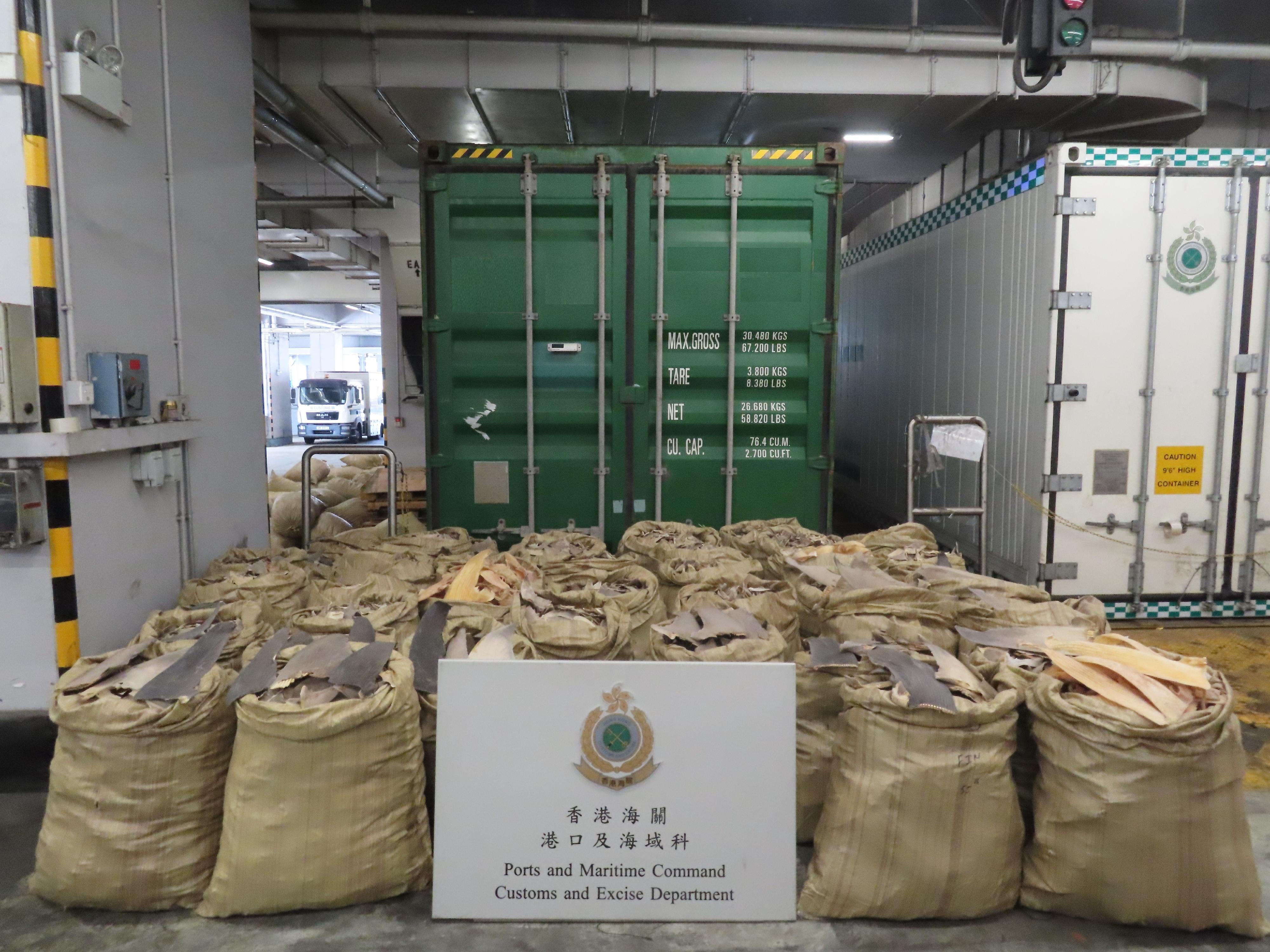 海關人員昨日透過風險評估,揀選及查驗一個從圭亞那抵港的四十呎海運貨櫃,並在貨櫃內發現該批懷疑受《保護瀕危動植物物種條例》(《條例》)(第586章)管制的乾魚翅。