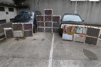 海關昨晨在流浮山進行反私煙行動。行動中,海關人員發現兩名男子在岸邊搬運貨物至一輛私家車。海關人員截查該兩名男子並搜查車輛,在車上搜獲十一個發泡膠箱,內藏約十萬支懷疑私煙。海關人員隨後在附近另一輛私家車內搜獲十個發泡膠箱,亦內藏約十萬支懷疑私煙。該批懷疑私煙市值共約五十五萬元,應課稅值共約四十萬元。海關拘捕該兩名二十三歲男子和扣查該兩輛用作分銷懷疑私煙的私家車作進一步調查。