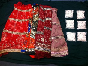 該名外籍女子來自印度新德里,海關人員在其託運行李中搜出共重約一點六八公斤的海洛英。該批毒品分別被收藏於六條長裙的刺繡邊內,意圖藉此避過海關人員之檢查。