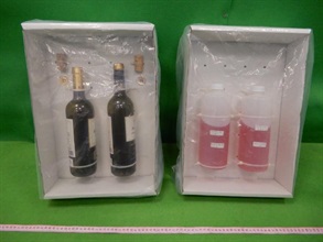 一名男旅客今日從荷蘭阿姆斯特丹飛抵本港。海關人員替他進行清關時,在其寄倉行李箱內發現兩個載有懷疑液態可卡因的酒瓶,遂拘捕該名男子。