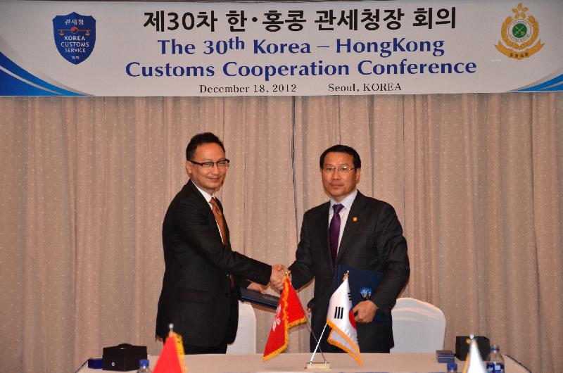 香港海關關長張雲正今日(十二月十八日)在南韓首爾出席「第三十屆香港海關與韓國海關合作會議」,並與韓國關稅廳廳長周英燮簽訂協議以鞏固兩地海關更緊密的合作關係。