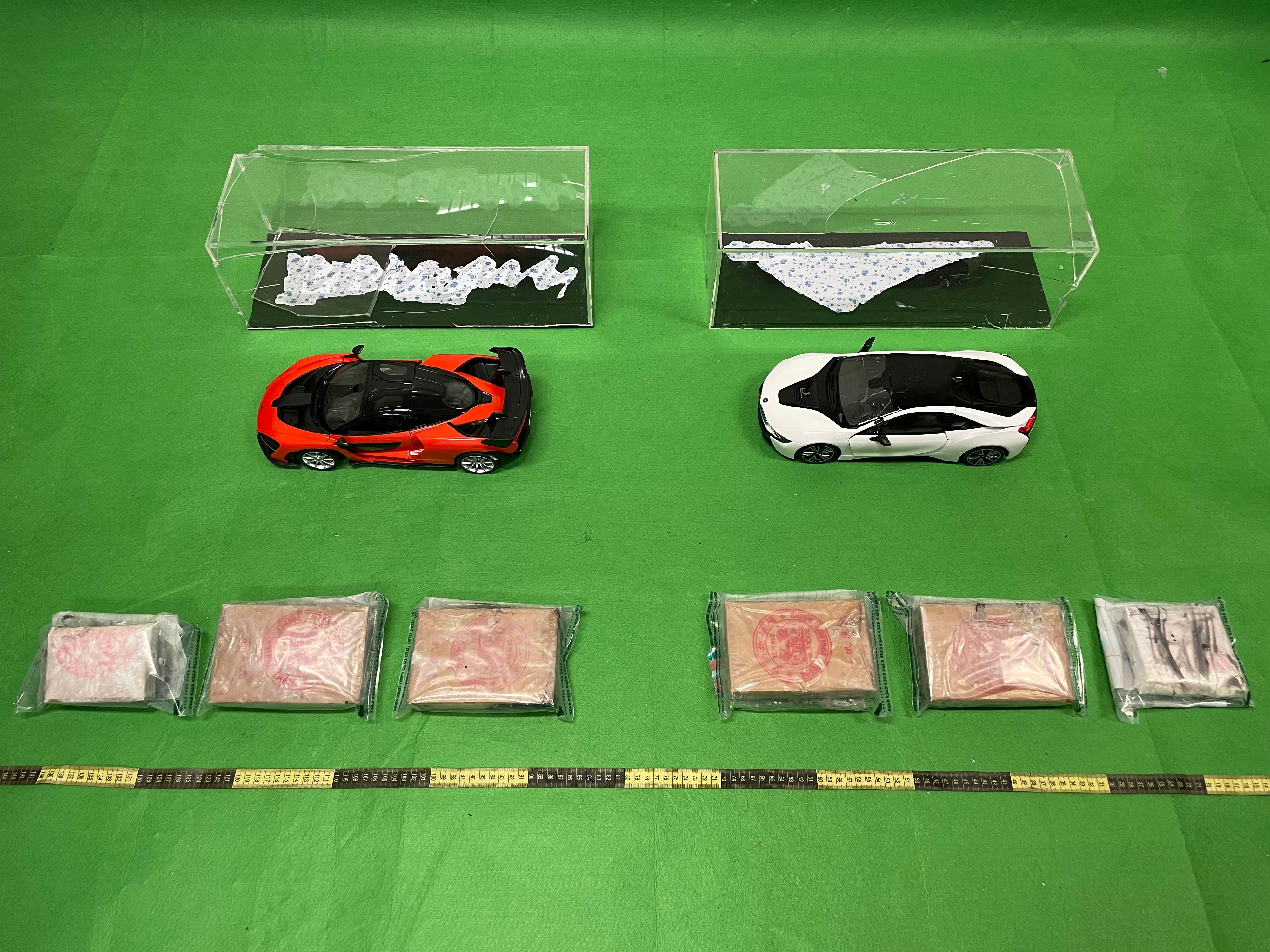 海關於上述兩日在機場檢查兩件從馬來西亞到港,分別報稱載有化妝品及燈籠的空運郵包,並於每個郵包內發現兩個藏有懷疑海洛英的模型汽車展示架。