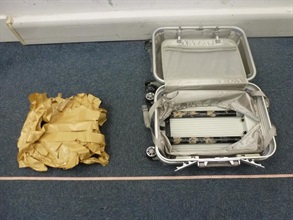海關毒品調查科人員根據線報於今日上午在機場截查一名準備乘搭航班前往日本東京的男子,在檢查他的一件手提行李箱時,發現一包懷疑冰毒收藏在行李箱底部的夾層內。海關毒品調查科人員於是拘捕該名男子。三名與被捕男子同行懷疑涉案的男子亦被拘捕作進一步調查。