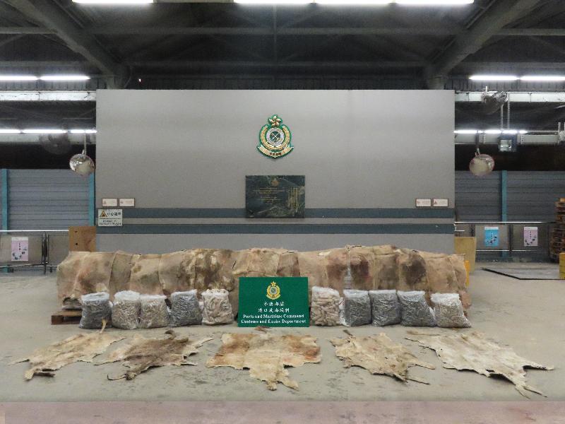 海關人員透過風險評估,揀選及查驗一個從埃及抵港,報稱載有食鹽的貨櫃,並在貨櫃內發現該批懷疑走私海參及驢皮。