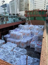 海關人員昨晚在機場對開海面進行反走私行動,發現一艘可疑躉船,人員即時採取行動,並在躉船上檢獲該批懷疑走私凍肉。