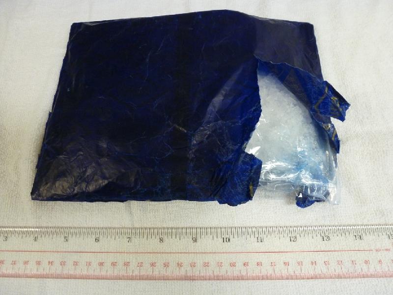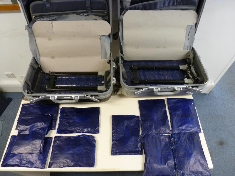 海關人員今日(二月二十三日)在香港國際機場離境層截查兩名準備前往日本東京的男子,在其行李箱的暗格內搜出共重約二點二公斤甲基安非他命(俗稱「冰」),市值約一百七十萬元。