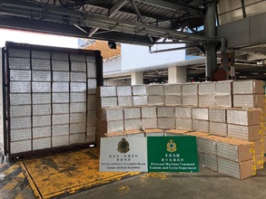 海關人員今日透過風險評估,揀選及查驗一個從新加坡抵港並準備轉運至菲律賓、報稱載有卡拉OK播放機的海運貨櫃。經檢查後,海關人員在貨櫃內的一千零三個紙箱中發現該批懷疑私煙。