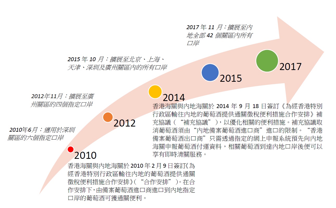 由2017年11月9日起,透過《經香港輸往內地葡萄酒通關徵稅便利措施》(“便利措施”),經香港轉口往內地全部42個關區的葡萄酒可享有即時清關的待遇。